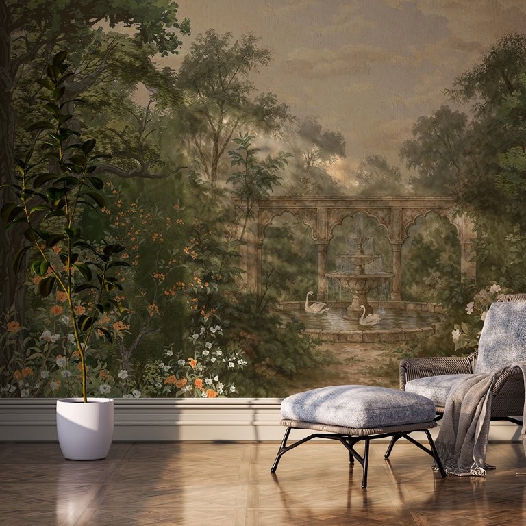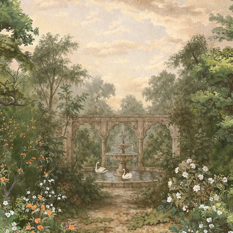Aranya, In a hushed emerald grove, sculpted arches cradle a moonlit fountain where two swan couples trace whispered vows on glassy water; leaves murmur of fidelity, trunks stand as silent witnesses, and the air holds the quiet promise of trust and timeless union.