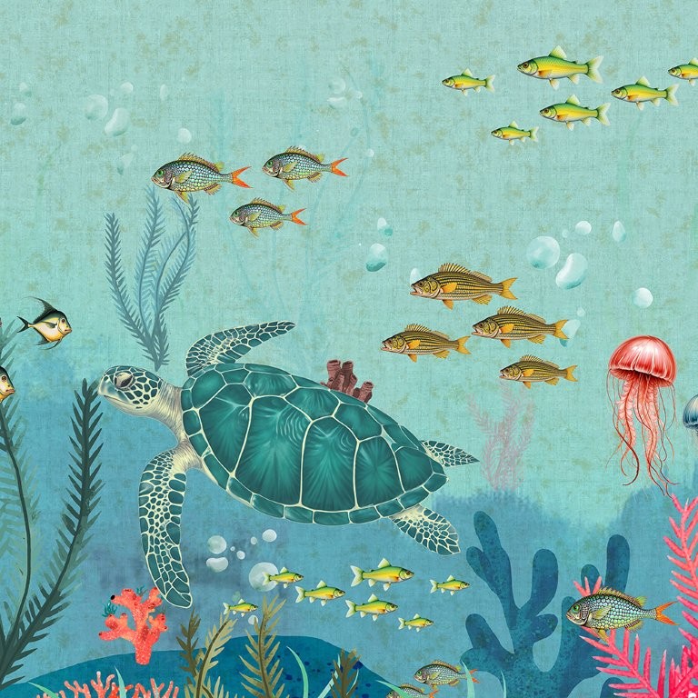 The “Ocean Bliss” wallpaper design is a serene and soothing escape into the heart of the ocean, perfect for creating a peaceful, calming atmosphere in any child’s room. The wallpaper showcases the beauty of marine life in soft, pastel shades of blue, turquoise, and coral, evoking the tranquil and refreshing essence of the sea. Gentle waves ripple across the background, while friendly sea creatures like graceful turtles, and colorful fish swim harmoniously through a vibrant underwater world. Delicate coral reefs, jellyfish, soft seaweed, and shimmering bubbles create a peaceful, dream-like environment that invites kids to relax and unwind.