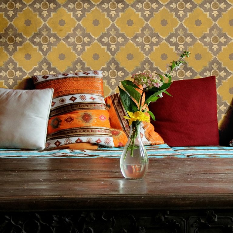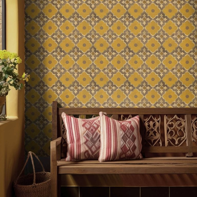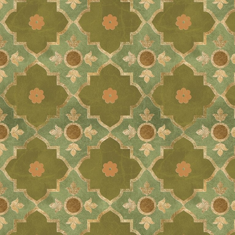 The Warmstone design evokes the timeless elegance of traditional motifs blended with earthy, grounded tones. It features a harmonious geometric tile pattern with floral and ornamental shapes, creating a rich tapestry of visual rhythm and warmth.